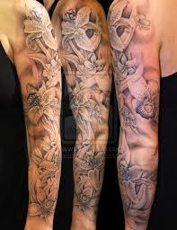 Sleeve tattoo designs are named as such because the ink covers the arm like the sleeve of a shirt would. Aficionados who like to enfold their whole bodies with ink prefer the full sleeve. This means that the whole arm, from the shoulder to the wrist, is tattooed. Of course, there's the half and the quarter sleeve, for those who are 'less adventurous'.
